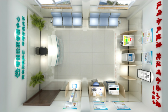 該方案是經(jīng)典的健康小屋落地模式,設(shè)有登記服務(wù)臺、體檢等待區(qū)、健康宣教區(qū)、體檢設(shè)備分布區(qū),可合理利用場地空間,根據(jù)資金預(yù)算進(jìn)行布署。適用于鄉(xiāng)鎮(zhèn)衛(wèi)生院、社區(qū)衛(wèi)生服務(wù)中心、醫(yī)養(yǎng)結(jié)合機(jī)構(gòu)、療養(yǎng)康復(fù)機(jī)構(gòu)等;