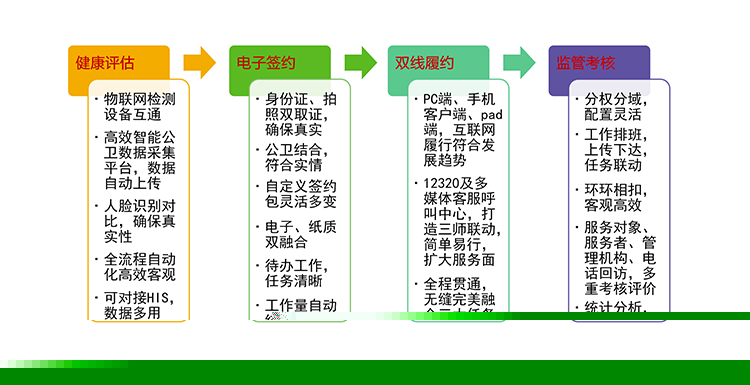 家庭醫(yī)生簽約平臺是實施家庭健康管理的服務(wù)平臺,它在社區(qū)范圍內(nèi),以家庭為單位,由社區(qū)衛(wèi)生服務(wù)中心和區(qū)域醫(yī)療衛(wèi)生協(xié)同服務(wù)體系提供支撐,建立居民健康檔案為分級診療制度建設(shè)逐步形成基層首診、雙向轉(zhuǎn)診、急慢分治、上下聯(lián)動的分級診療和就醫(yī)真正政 策落地模式,全方位的生命體征采集和檢測,線上線下的數(shù)據(jù)干預(yù),為家庭成員提供綜合、連續(xù)、有效的基本衛(wèi)生服務(wù)。