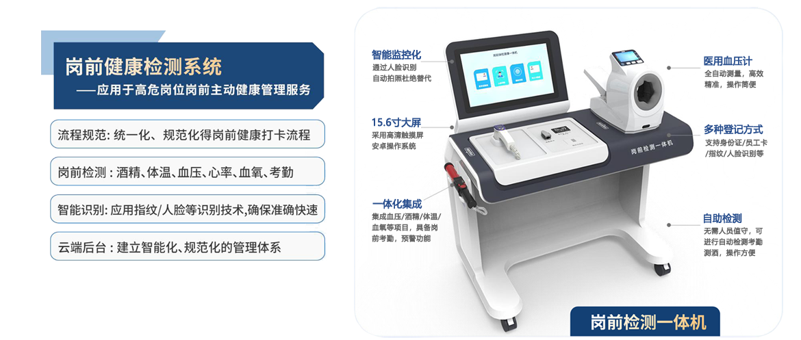 崗前健康檢查一體機是一種用于進行員工健康檢查和篩查的設備,可以通過指紋識別、人臉識別等方式快速登錄,并可準確地檢測員 工的健康狀況,包括 血壓、心率、酒精、體溫、血氧 等多個項目,對于符合上崗健康狀態(tài)得員工允許考勤打卡。
