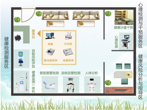 健康小屋配置分兩大部分組成:測量工具配置和干預(yù)指導(dǎo)配置。 1、測量工具配置。就是配置常用的簡便的測量設(shè)備,如身高儀、體重儀、血壓儀、肺功能儀、血糖監(jiān)